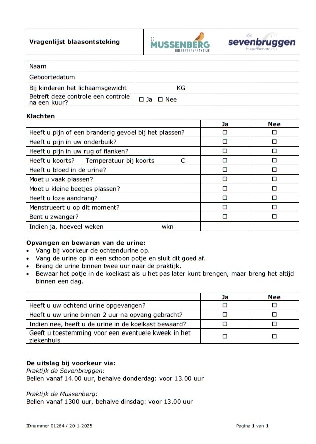 Vrouwen kunnen nog wel eens last hebben van blaasontsteking. Als u pijn hebt bij het plassen of heel vaak moet plassen, dan is het verstandig om uw urine te laten onderzoeken. Geef uw urine voor 10 uur 's ochtends af bij de assistente en u kunt meestal aan het eind van de middag al bellen voor de uitslag. Zet wel duidelijk uw naam en geboortedatum op het potje en geef aan welke klachten u ervaart: gebruik de vragenlijst en lever deze samen met uw urine in bij de assistente.